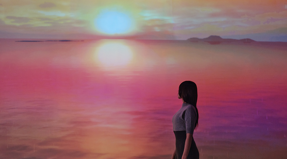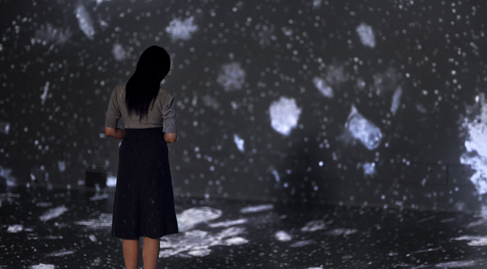 夜明けの海霧、雲間から射す光芒、果てしなく広がる雲海、雷が轟く積乱雲、薄明薄暮の色彩、蒼穹──思わず目を奪われる刻々と移ろう空の多彩な表情を、ダイナミックな没入体験へと昇華させた作品です。雲海、積乱雲、天使のはしごなど、さまざまな気象現象を雲研究者の荒木健太郎さん監修のもと精緻に描写。鑑賞者は、空中を散歩するかのように雲海の上を進み、積乱雲の内部へ分け入っていきます。さらにはミクロの世界で氷晶が雪結晶へと成長し、あられ、そして雨粒へ変化していく現象と対面します。 本作では、天井高約8mの空間を囲む4K映像が前後左右から足元にまで広がり、視界一面が空に包まれるような没入感を創出します。さらに、12.2チャンネルの立体音響システムや霧・風の演出効果を取り入れることで*、雲に包み込まれるような感覚を立ち上げます。朝霧の水面から夕焼けの空へ、マクロな雲の世界からミクロな氷晶の世界へ。雲の循環を多元的に交錯させながら、自然の美しさ、繊細さ、そして力強さを体感する作品として提示します。 * 霧の演出は、特別インスタレーションの時間のみ実施。