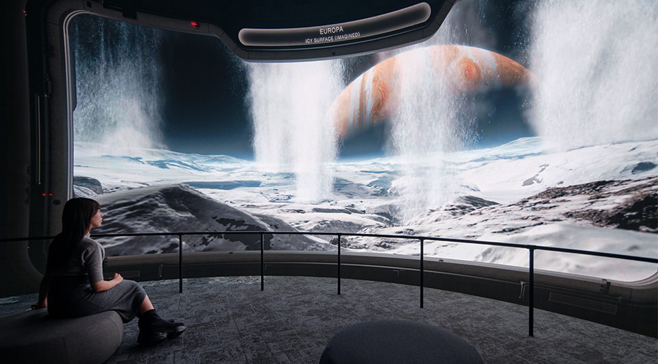 人類が歩んできた惑星探査による発見と、宇宙に広がる未踏の領域——。その両方を科学観測データと科学的知見に基づき、高精細なCGで没入型映像体験として提示。既踏から未踏の領域につなぐ「宇宙の旅」へ鑑賞者を誘います。鑑賞者は宇宙船のラウンジを模したシアター空間で、窓の外に広がる天体の景色や現象、そして未踏の世界と対峙します。旅のガイドを務めるのは、音楽家・青葉市子さん。壮大なスケールで眼前に広がる宇宙と対比し、一人ひとりの心へそっと寄り添うような声が、太陽、火星、木星および衛星エウロパ、そして太陽系外へと続く宇宙の旅を詩的に彩ります。 本作は、NASAの科学観測データや天文学者・渡部潤一さん監修による科学的知見を映像美で包み込むように演出。広がり続ける未踏の領域を立ち上げながら、鑑賞者個人の内側にも息づく未知と照応させることで、新たな驚きやまなざしをもたらします。私たちを取り巻く世界に存在する未知へのあこがれ、未踏の扉が開かれた時の高揚感、まだ見ぬ世界を思い描くこと—。こどもから大人まで幅広い世代の感性を静かに揺らし、余韻を楽しめる映像作品を目指しました。