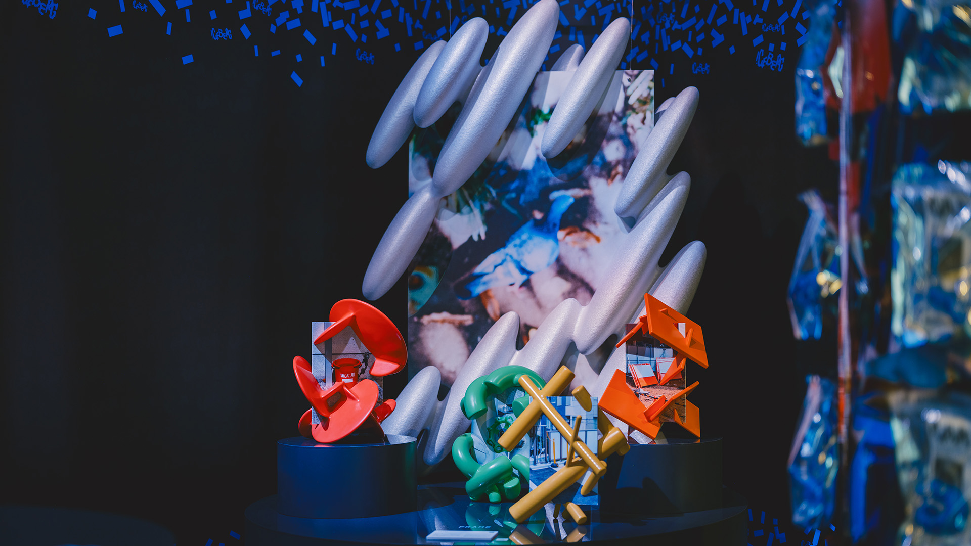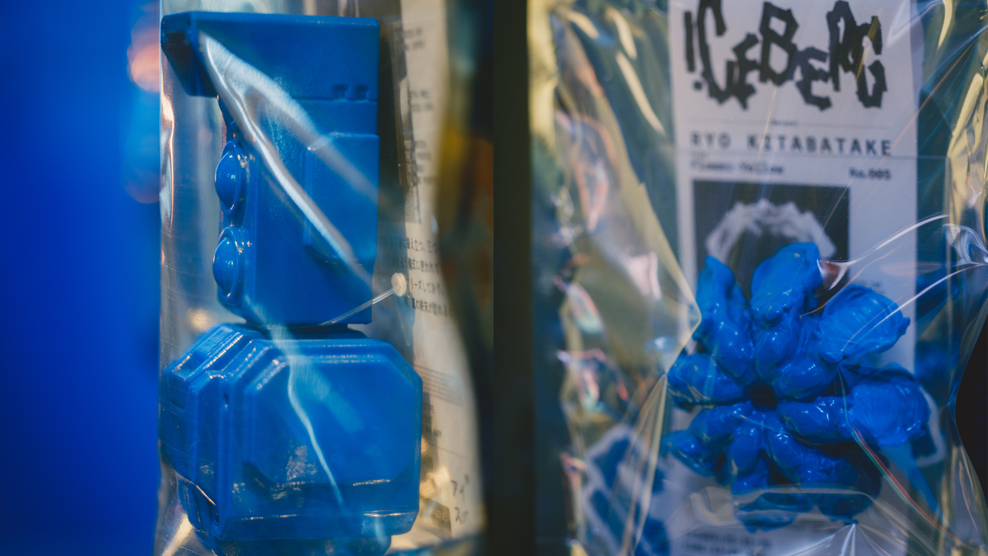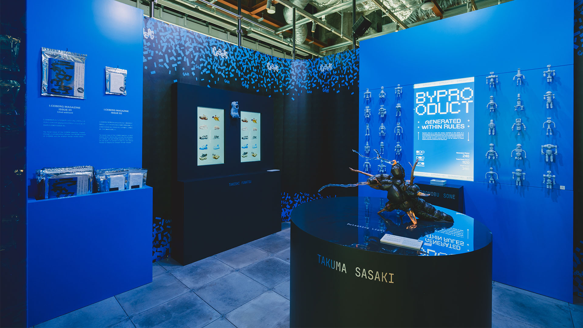 主要作品の制作過程で生まれた立体造形や、プロジェクトの活動をまとめたマガジンを会場で販売した。 Fragments of Iceberg 氷塊の中に眠る物語を探る過程で生まれた思考の「かけら」を立体造形として50体制作。それらの造形は、まだ明確な意味を持たないが、メゾン5人それぞれの思想を色濃く反映しており、「かけら」を通して来場者と物語を共有した。 I.CEBERG MAGAZINE – ISSUE 01 (2nd edition) I.CEBERGのメゾンたちのアートワークと、グラフィックデザインスタジオ・emuni inc.とのコラボレーションによって生まれたZINE。 I.CEBERG MAGAZINE – ISSUE 02 I.CEBERGの思想をサイエンスライター・森旭彦氏が描き出し、メゾンそれぞれが自らの言葉で思想を表現したZINE。ISSUE 01とは対極的に、言葉を使ってその輪郭を表現した。